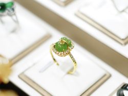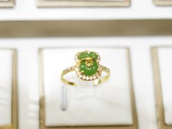Thiết kế: Nhẫn phong thủy dáng ôm tay, trung tâm là túi tiền ngọc bích, phía trên có móc vàng biểu tượng cát khí, xung quanh viền đá nâng đỡ – tạo thế vượng tài.