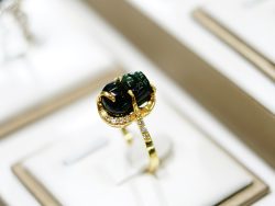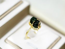 Cẩm thạch thiên nhiên tạo nên linh thú có độ bóng và năng lượng thuần khiết, kết hợp cùng vàng 18K và đường viền đá CZ bao quanh như vầng sáng bảo vệ tài khí khỏi xui rủi. Thiết kế nhẫn phong thủy này không chỉ mang giá trị thẩm mỹ, mà còn như một “lá bùa sống” hộ mệnh, giúp người đeo cảm thấy vững tâm và may mắn hơn trong giao dịch tài chính.